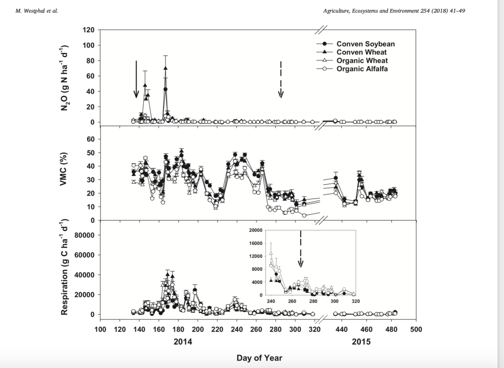 The image is a chart from Megan Westphal’s research paper – ‘Nitrous oxide emissions with organic crop production depends on fall soil moisture’, Westphal et al., published in 2018. It is a critical piece of research in looking at how water impacts the cycling of nitrous oxide (a greenhouse gas) in the atmosphere and how that is affected by various farming practices. I won’t lie – it’s a tough read, full of facts and charts. But this is the type of research that is so important in understanding how to move forward as people who – you know, kind of need to eat food to survive.